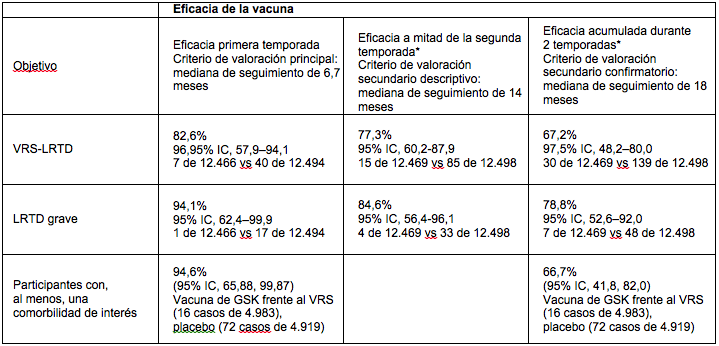 La eficacia, siguiendo un esquema de revacunación anual, se evaluó como criterio de valoración secundario confirmatorio en este estudio. Los datos muestran que la eficacia acumulada durante dos temporadas completas de VRS en participantes que recibieron una segunda dosis de la vacuna fue del 67,1% (IC del 97,5%, 48,1-80,0, 30 de 12.469 frente a 139 de 12.498), lo que sugiere que no parece que la revacunación después de 12 meses confiera beneficios adicionales a la población en general1. El programa de desarrollo clínico continuará evaluando el seguimiento a más largo plazo para obtener información sobre el momento óptimo de una posible revacunación.