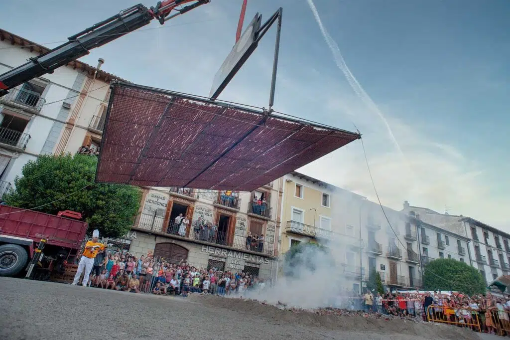De esta forma, surgió la gran idea. ¿Por qué no construir una parrilla gigante para poder asar la longaniza de una sola vez? Dicho y hecho. En la siguiente edición, la de 1997, se introdujo el elemento más espectacular de la fiesta: una parrilla de 25 m2. En ella se puede asar una longaniza de más de una tonelada de peso y cerca de un kilómetro de longitud. ¿Y cómo le damos la vuelta a semejante parrilla? Pues con una grúa telescópica. Espectacular.